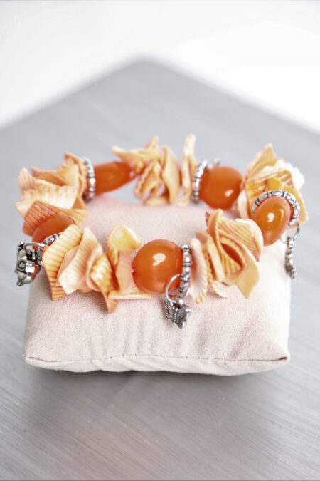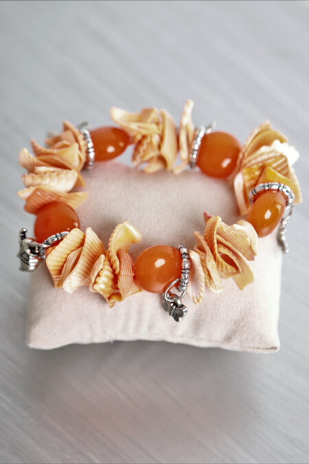 Ásványokból, fém kiegészítőkkel, kagylókkal, gumis megoldással.