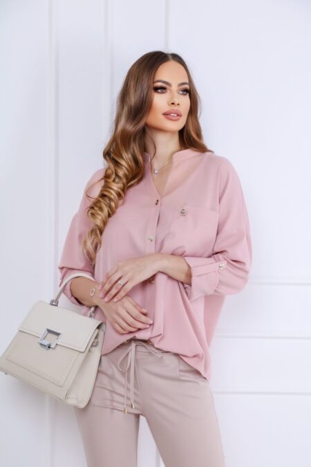 Elasztikus anyagból készült, lezser fazonnal, gombos megoldással, zsebbel, brossal.