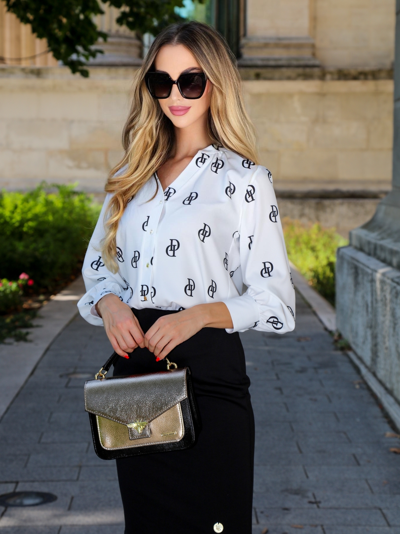 DACOTA elegáns női ing. Fehér alapon, anyagában mintás női ing ezüst színű gombokkal.