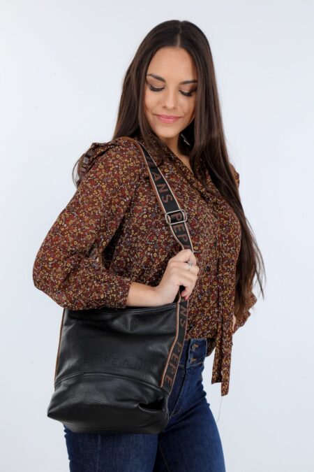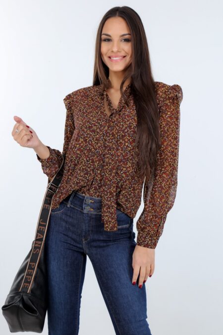 Vékony anyagból, lezser fazonnal, aláöltözettel, vállán fodrozással, nyakán megkötővel, gombos megoldással, fém márkajelzéssel.