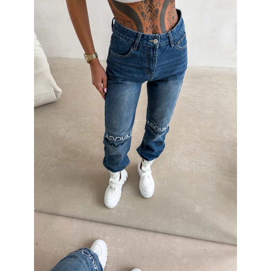 - A térd magasságában található vízszintes varrások nyers, rojtos finiseléssel (surowe wykończenie) készültek, melyet az OLAVOGA márkajelzés díszít.