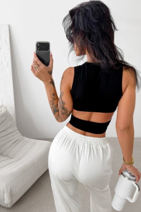 - Hátul kivágással, amely kiemeli a hát vonalát és nőies megjelenést biztosít.Anyagösszetétel: